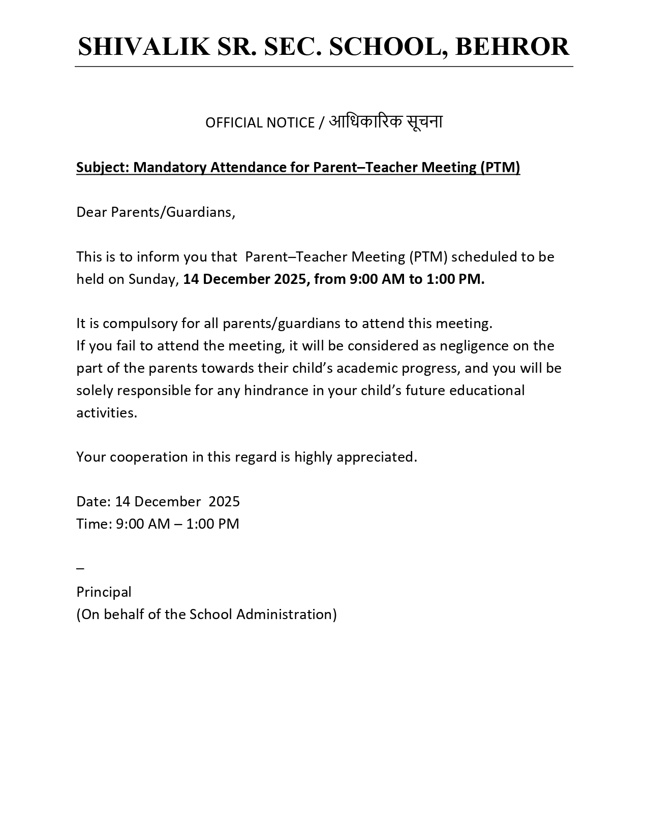 Shivalik Sr. Sec. School, Behror