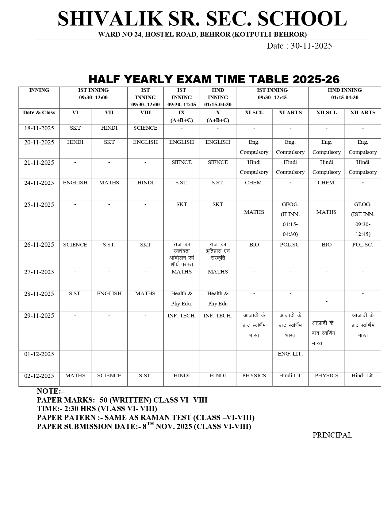 HALF YEARLY EXAM SECHUDLE...